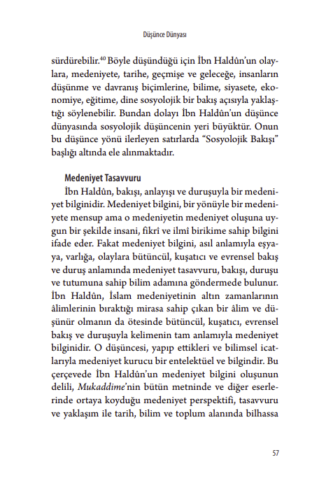 İbn Haldûn, İslam düşünce tarihinde mühim bir yer tutan ve eserlerinin tesiri bugüne kadar uzanan bir düşünürdür. Fikirleri, görüşü, bakışı, duruşu ve bilimsel çabasıyla insanlık için önemli eserler ortaya koymuştur. İbn Haldûn’un Mukaddime’sinin, diğer eserlerinin, hayat hikâyesinin, düşünce dünyasının ve kişilik özelliklerinin yanı sıra olay ve olgulara yaklaşımında da bir medeniyet birikimi tezahürü, bir özgünlük, çığır açıcılık ve çağları aşma niteliği mevcuttur.