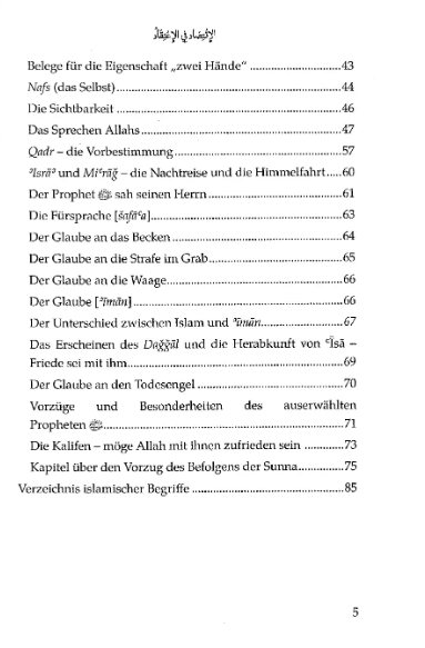 Als die ursprüngliche Glaubenslehre gilt die sunnitische, da alle anderen Glaubenslehren nach ihr entstanden und sich auf bestimmte Gründer zurückführen lassen. Als dem Sunnitentum zugehörig sehen sich wiederum drei Denkschulen: die Aschariten, die Maturiditen und die ahl al-athar - die Überlieferungstreuen, auch Leute des Hadith genannt. Das vorliegende Buch ist eine Darstellung der Glaubenslehre aus der Sicht der Überlieferungstreuen, diese Lehre basiert rein auf dem wörtlichen Verständnis der Gesamtheit der Texte aus Quran und Sunna.