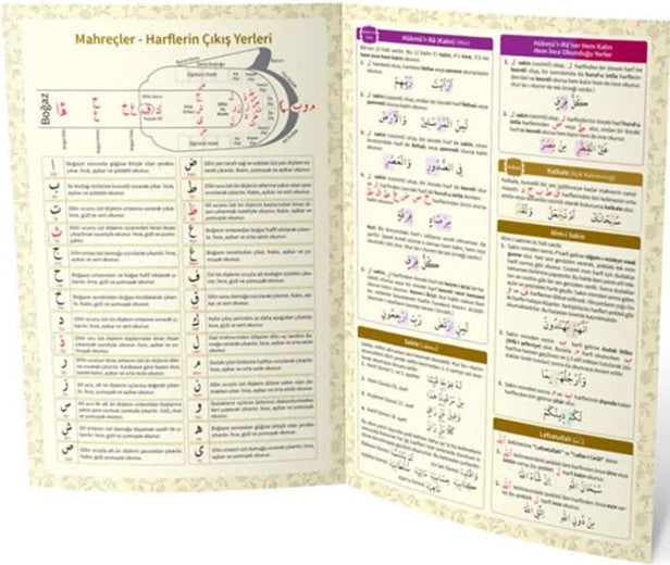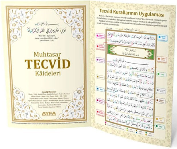 Tecvidli Kuranı Kerim Kartelası ile Tüm Tecvid Kurallarını bir arada bulabilirsiniz. 8 Sayfadan oluşan bu kartela ile Kuran-ı Kerim Tertil üzere okumak artık çok daha kolay. Kıraat ilmi içinde yer alan Tecvid, Kur'an okuma usulü ve ilmidir.Harflerin çıkış yeri, sıfatı, uzun veya kısalığı, genişlik veya darlığı, birleştirme ve ayırma, kalın ve ince vurguları konuları bu ilmin konularıdır. Kelime manası olarak Tecvid (cewede) kökünden gelip, bir şeyi güzel yapmak, süslemek, hoşça yapmak manasına gelir. Cewde Arapça da kalite demek olur ki, bir şey çok güzel olduğu zaman kullanılır. Kuran-ı Kerimi çok güzel ve kuralına göre okuyan insana, Kuran-ı okumasıyla güzelleştiren manasında mücevvid denir.