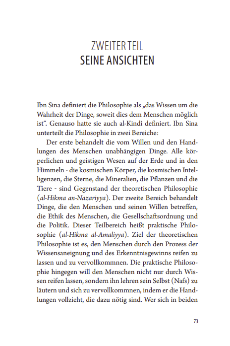 Ibn Sînâ ist ein Gelehrter, der den Glauben und die Weisheit als im Innersten identisch ansieht. Er ist dank seiner Mühen um eine Vereinigung von Verstand und Offenbarung, von Religion und Philosophie zu einem der Eckpfeiler der islamischen Geistesgeschichte herangewachsen.