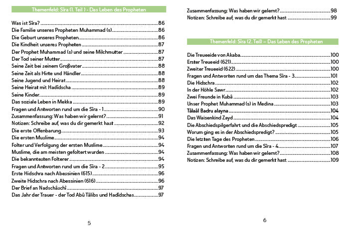 In sechs Kapiteln werden die Glaubensgrundlagen des Islams (Îtikâd), Gottesdienste (Ibâda) wie das Gebet (Salâh), das Fasten (Sawm), die Pilgerfahrt (Hadsch) und die Zakat-Abgabe behandelt, das Leben des Propheten Muhammad (s), der gute Charakter (Ahlâk) und religiöser Gesang behandelt. In jedem Kapitel wird zuerst Wissen zum Thema vermittelt, das anschließend durch Fragen sowie Schreibaufgaben gefestigt. Geschichten, Gedichte und Gesänge runden das Buch ab.