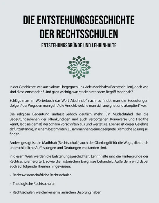 3) Rechtswege der islamischen Rechtslehre: Diese Rechtswege legen die Regeln des menschlichen Miteinanders aus und erläutern die Bindung zwischen Allah und dem Menschen auf der Basis des Korans und der Sunna. Um all diese Themen ausführlich zu erläutern, muss man mehrere Bücher verfassen. Daher haben wir versucht, die Themen kurz und bündig darzustellen. Wir haben es dennoch nicht geschafft, alles in einem Band festzuhalten. Daher haben wir das erste Band in „Politische und islamische Rechtswege“ unterteilt. Für die Rechtswege der religiösen Normen haben wir ein zweites Kapitel vorgesehen, welches getrennt ist.